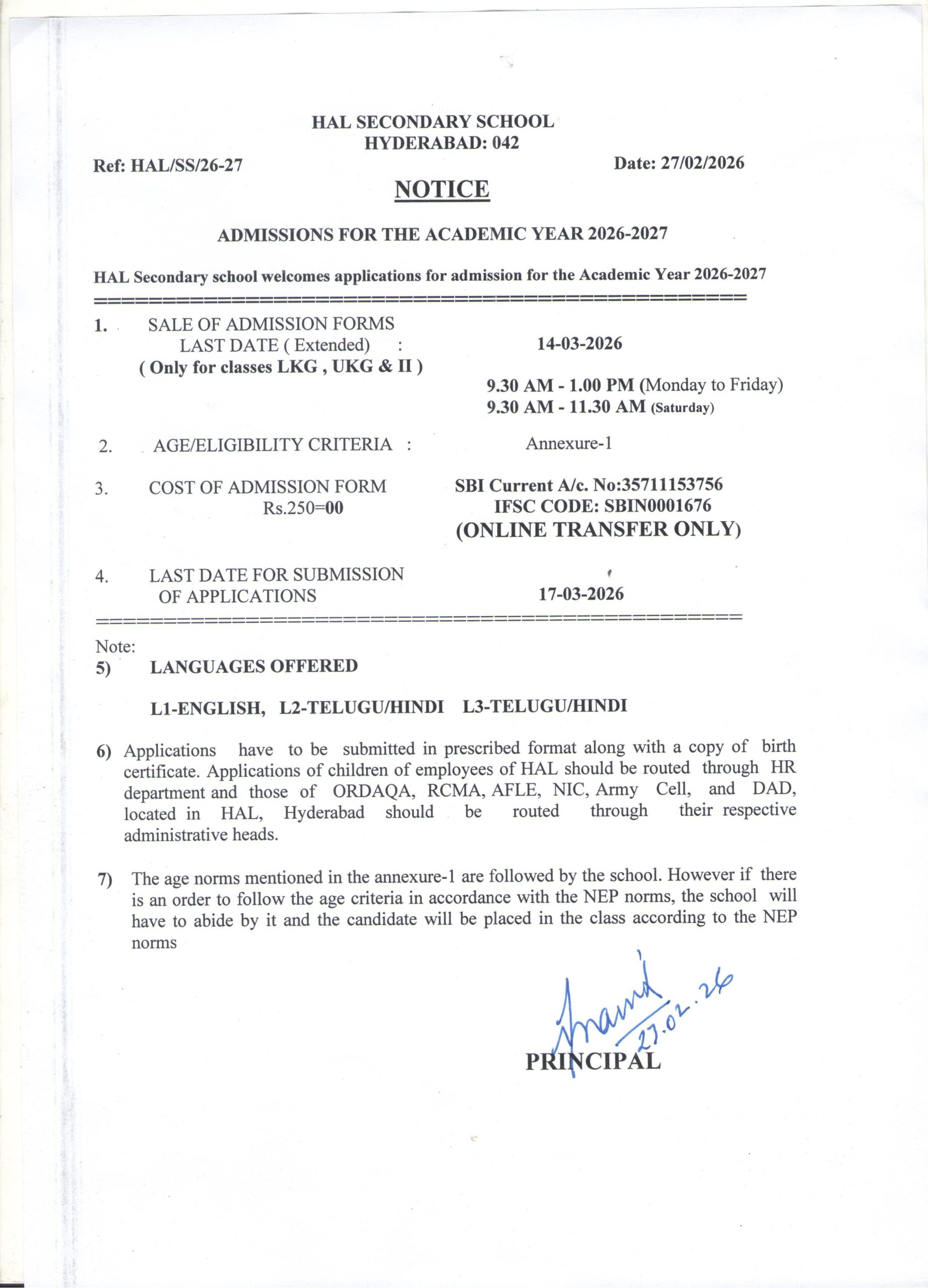 School Code : Old Code – 48171 & New Code – 57627